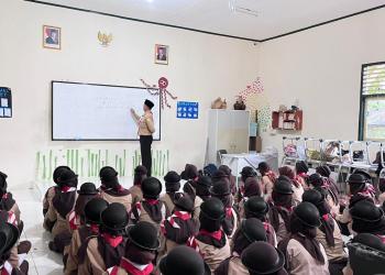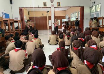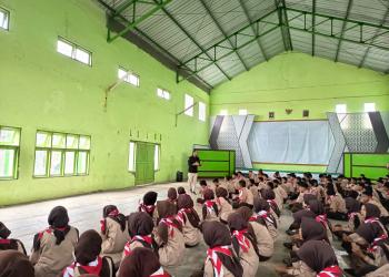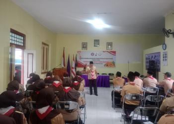 Ketua Bawaslu Wonosobo, Sarwanto Priadhi, memberikan penjelasan kepada siswa-siswi SMA Negeri 1 Selomerto terkait pelaksanaan open rekrutmen Saka Adhyasta Pemilu, Jumat (24/10/2025).