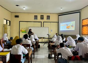 Anggota Bawaslu Fitrian Puji Istriatno sedang menjelaskan mengenai Saka Adhyasta Pemilu di SMK Andalusia