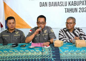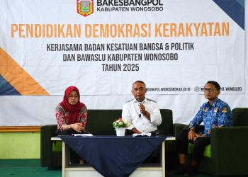 Kordiv P2H Dhyan Kartika Wulandari, Kordiv PP & Datin Ariantono, dan Staf Bawaslu Wonosobo Bangkit Permadi saat tampil dalam Pendidikan Demokrasi Kerakyatan tanggal 1 Oktober 2025